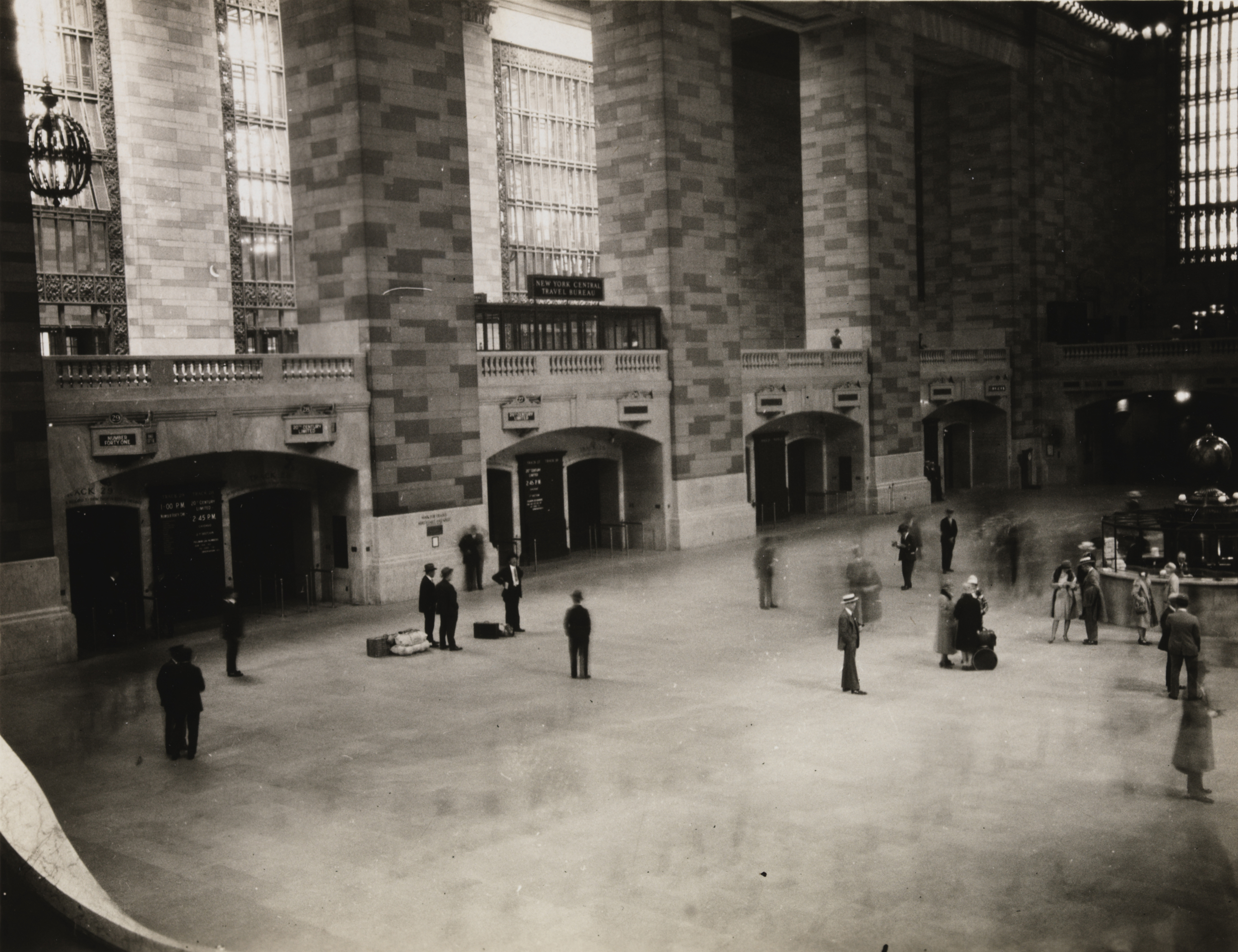 Shot in the middle of Grand Central Station in 1928, this shot also explores the use of long shutter speeds to show the passage of time. It shows many travelers moving through the station on the way to their trains, most of whom become just small blurs in the foreground. The only people who are truly visible were standing either completely or mostly still for the duration of the shot. Any person walking or running through the station to catch a train is only recorded as a haze of legs and feet. The blurred movement gives the feel and energy of Grand Central Station in transit.