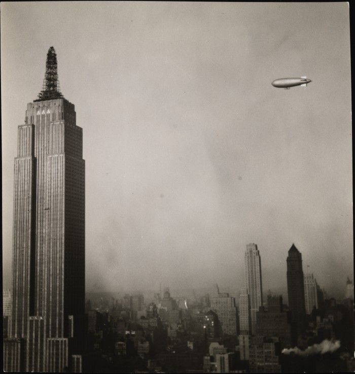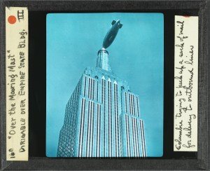 The images in our collection don’t show dirigibles actually docking at the Empire State Building, because no dirigible successfully docked there. In fact, Christopher Grey in The New York Times gently hints that the idea for a mooring mast may have been a ruse to add a few extra feet to the building. The tower is 200 feet tall, greatly widening the height difference between the Empire State Building and the second tallest building in the world at that time, the Chrysler Building.