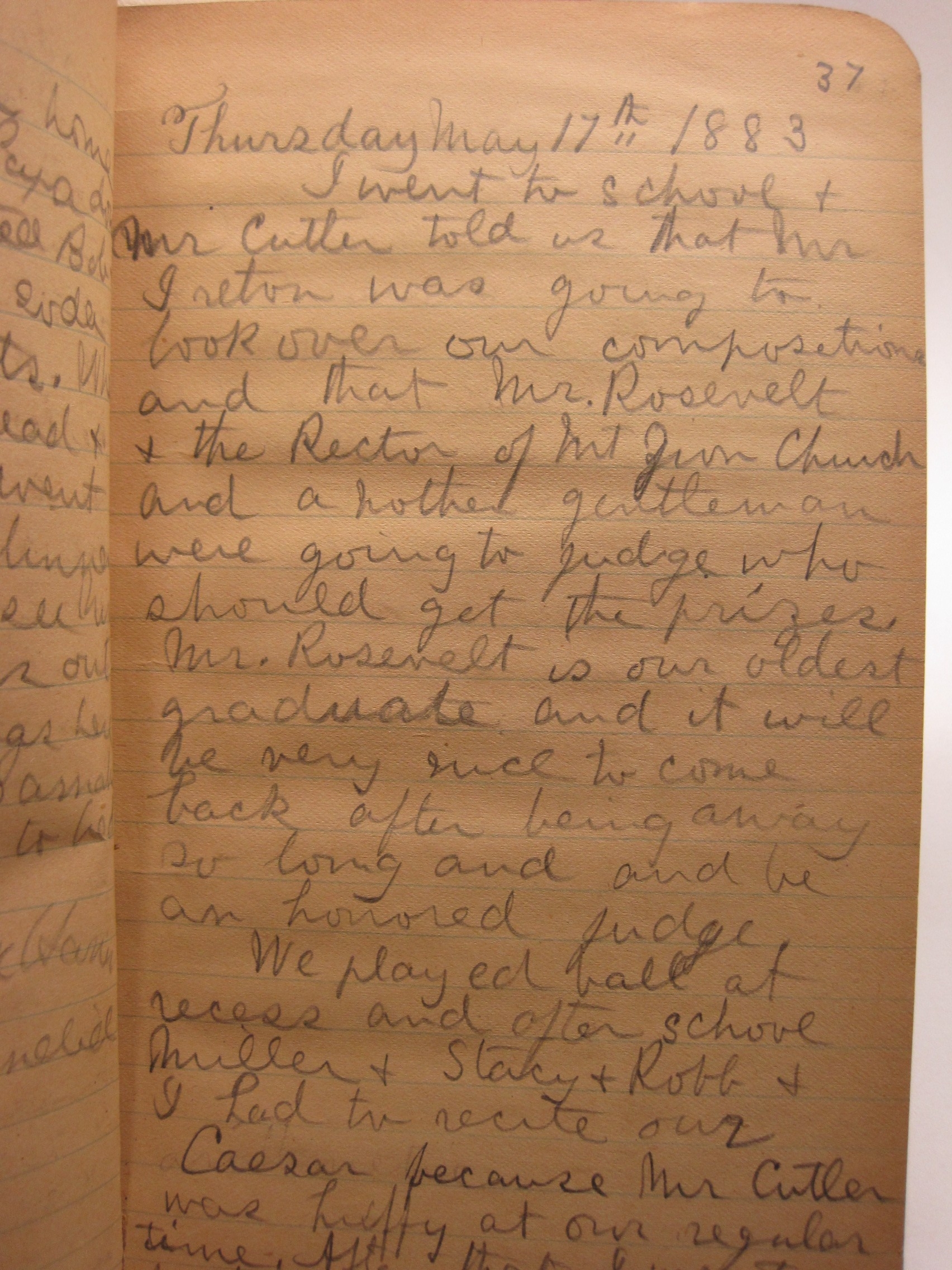 Fairfax’s diary entry for May 17, 1883, begins: “I went to school, and Mr. Cutler told us that Mr. Treton was going to look over our compositions and that Mr. Roosevelt and the Rector of Mt. Zion Church and another gentleman were going to judge who should get the prizes. Mr. Roosevelt is our oldest graduate and it will be very nice to come back after being away so long and … be an honored Judge.”