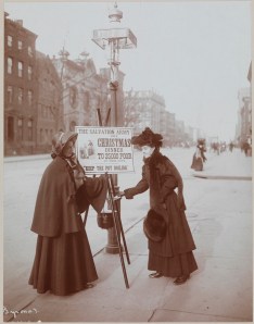 The Salvation Army began using red kettles in 1891 to collect money during the holiday season. In 1901, contributions to the red kettles in New York City provided the poor with a massive sit-down dinner in Madison Square Garden. This 1906 photo shows a scene familiar to New Yorkers even today.