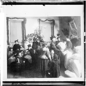 This picture shows teachers and students gathered around a Christmas tree in a tenement house run by a chapter of the International Order of The King’s Daughters and Sons. Margaret Bottome founded this charitable organization in her New York City home in 1886. The photo was taken around 1897.