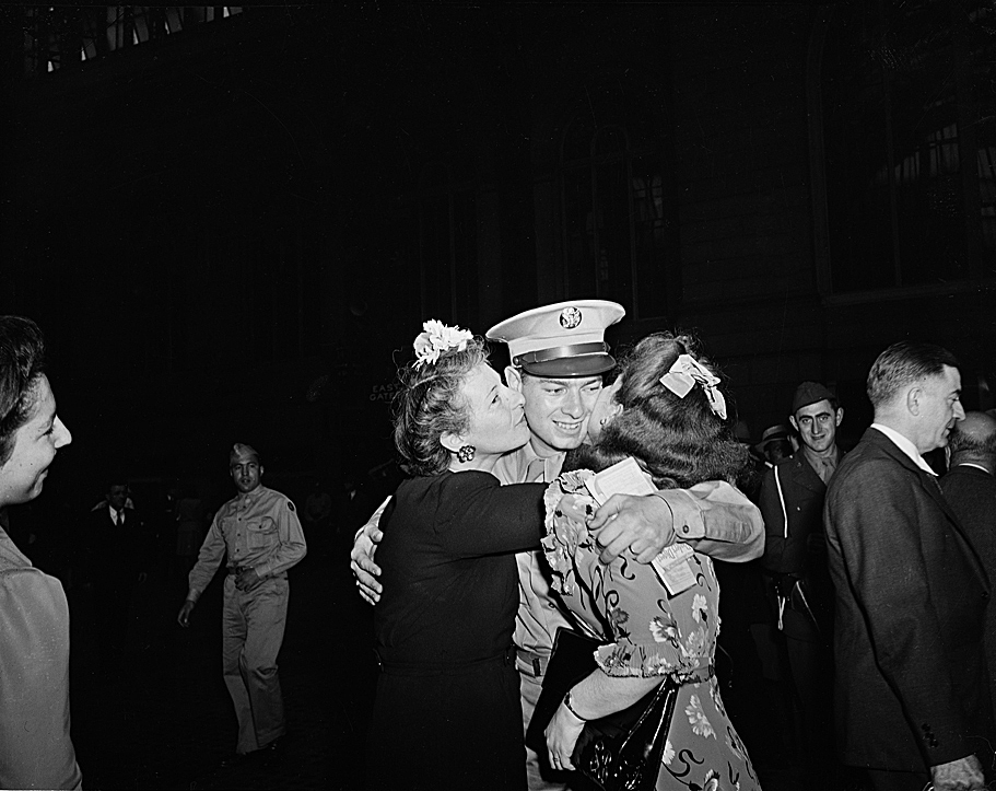 Weegee shows a softer side in a 1948 series of photographs for LOOK showing soldiers returning from World War II and reuniting with their loved ones.
