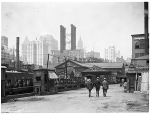 Arthur Hosking. Fulton Ferry. Pier No. 17. Fulton Ferry where Walt Whitman used to come and go on the East River. Banker’s Trust tower in the distance. 1920. Museum of the City of New York. X2010.18.194