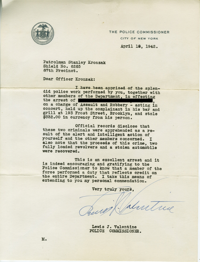 Letter of Recognition to Officer Stanley Kronzak from Police Commissioner Lewis J. Valentine, 1942, in the Stanley Kronzak Collection. Museum of the City of New York, 90.94.13.