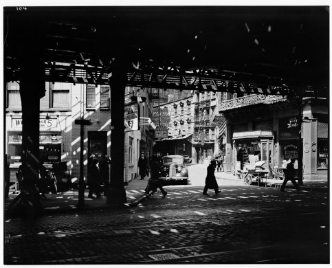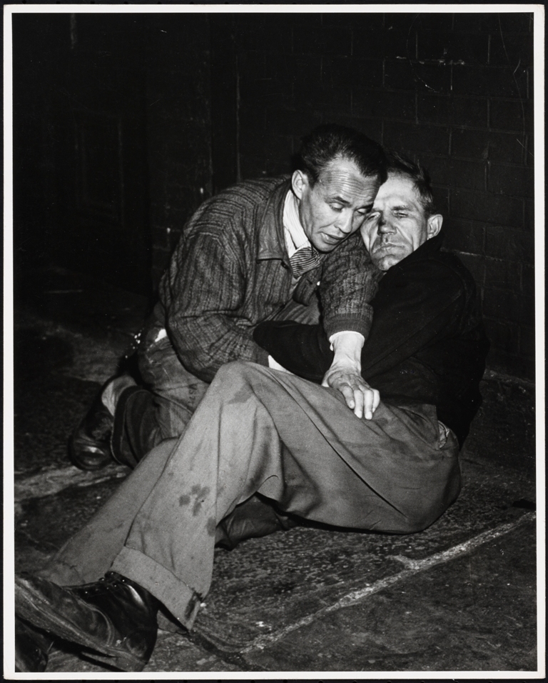 Walk the Bowery under the El at night and all you feel is a sort of cold guilt. Touched for a dime, you try to drop the coin and not touch the hand, because the hand is dirty; you try to avoid the glance, because the glance accuses. This is not so much personal menace as universal — the cold menace of unresolved human suffering and poverty and the advanced stages of the disease alcoholism. On a summer night the drunks sleep in the open. The sidewalk is a free bed, and there are no lice. Pedestrians step along and over and around the still forms as though walking on a battlefield among the dead. Standing sentinel at each sleeper’s head is the empty bottle from which he drained his release . . . The glib barker on the sightseeing bus tells his passengers that this is the ‘street of lost souls,’ but the Bowery does not think of itself as lost; it meets its peculiar problem in its own way — plenty of gin mills, plenty of flophouses, plenty of indifference and always, at the end of the line, Bellevue.
