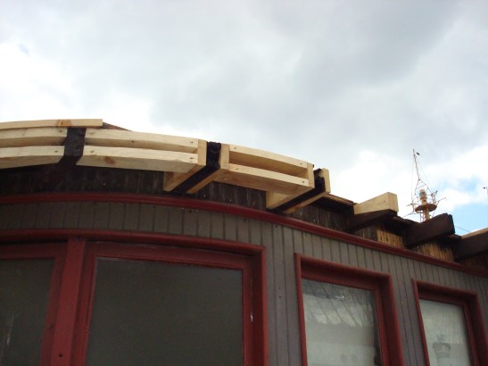 The first step was to remove all of the rotting wood, exposing the internal structure of the pilot house along with a few surprises, including the original canvas roof and a graffiti record of 1980’s-era love.