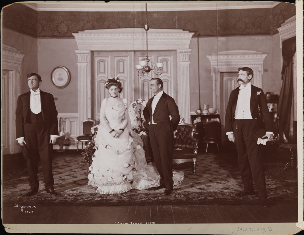 One of the most successful burlesquing teams was the duo of Joe Weber and Lew Fields who opened their Music Hall in 1896 to perform musical revues and burlesques of their own devising. (At the time the term “burlesque” described over-the-top parodies of popular theatrical productions and had less to do with the art of striptease.) One of Weber and Fields‘s most popular targets was the work of Clyde Fitch. Though his work hasn’t been performed on Broadway in decades, Fitch was one of the most prolific playwrights of early twentieth century. In 1909, the year he died, Fitch had four productions in Broadway theatres, three of which were new works. He saw over 60 productions of his work open on Broadway, often staged by him, and there have been over 30 feature film adaptations of his plays. (For more on Fitch’s life, check out the thoughtful bio at the The Clyde Fitch Report.)Thanks to the efforts of the equitable photographers at Byron Company (and the Museum’s Digital Team), the Collections Portal contains images illustrating Fitch’s original intentions and the fun Weber and Fields had subverting them.
