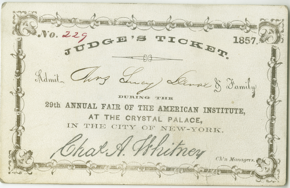 Judge’s ticket during the 29th Annual Fair of the American Institute at the Crystal Palace, 1857, in the Ephemera Collection. Museum of the City of New York. 36.409.58.