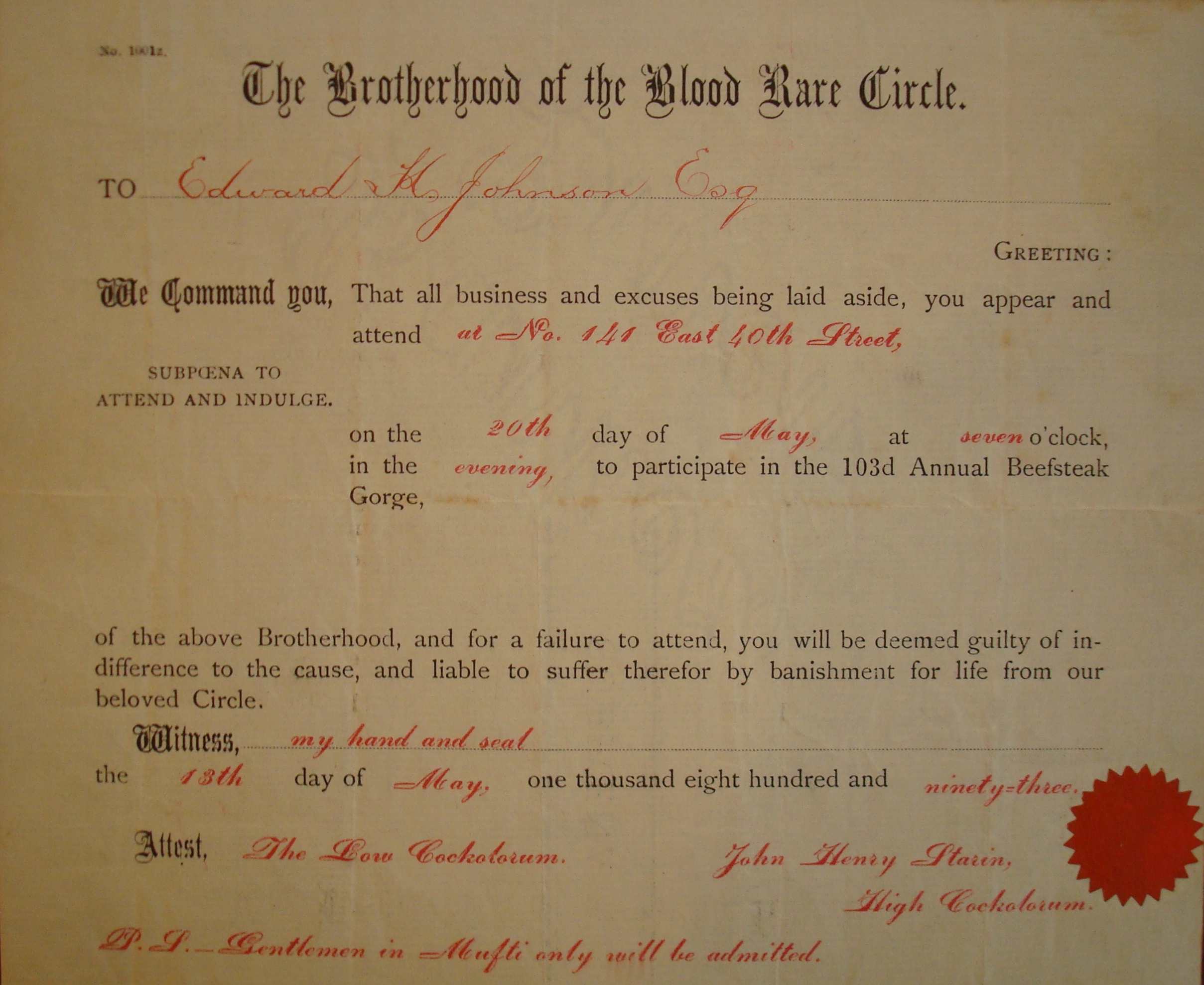 Invitation, The Brotherhood of the Blood Rare Circle, 1893. South Street Seaport Museum, William S. Miller Papers.