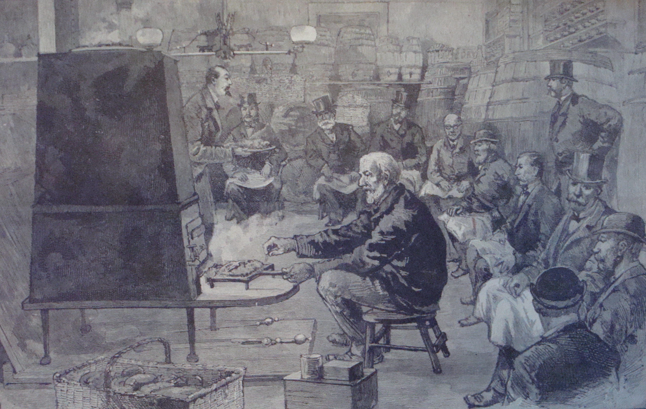Beefsteaks were initially all-male gatherings, with small groups of men gathering in rustic taverns or dingy cellars where, sitting on crates or stools, they would sing, tell stories, eat steaks, and drink ale with abandon. In these “dungeons,” etiquette was set aside. No knives or forks were allowed. The participants ate tender morsels of beef steak, accompanied by gravy-sopped slices of bread, with their hands, wiping the grease on large napkins or aprons.