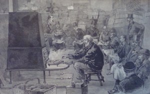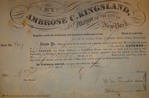 Newspaper clippings in the Seaport Archives collection report the gatherings of many of these clubs, including the Wall Street Club, the Dry Goods Men’s Club, and the Staten Island Beefeaters. Many give detailed descriptions of the gatherings and name the participants and their occupations. One newspaper article from the 1890’s raved “Will anybody who has ever eaten one of Uncle Billy’s beefsteak dinners forget it? The very remembrance makes one’s mouth water. The picture sticks in the memory – Uncle Billy on his low stool before the fire, with his broiler and his big shakers of pepper and salt, his face beaming, the guests seated about on boxes and stools and kegs; the big pewter tankard of ale that never got a rest for a moment.”