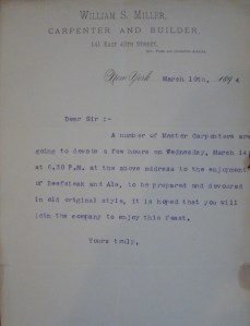 Although there were a number of venues for Beefsteak Dinners throughout New York City, beginning in the 1890s, the carpenter shop of William S. Miller on East 40thStreet was a popular and well-known place to enjoy this entertainment. Miller, a well-known carpenter and builder, followed in the footsteps of his father, Anton W. Miller, who was, by some accounts, the “father” of the New York City Beefsteak. Known as “Uncle Billy,” Anton Miller was the affluent proprietor of a tavern at the corner of Market and Monroe Streets in Lower Manhattan originally known as Shannon’s Corner.