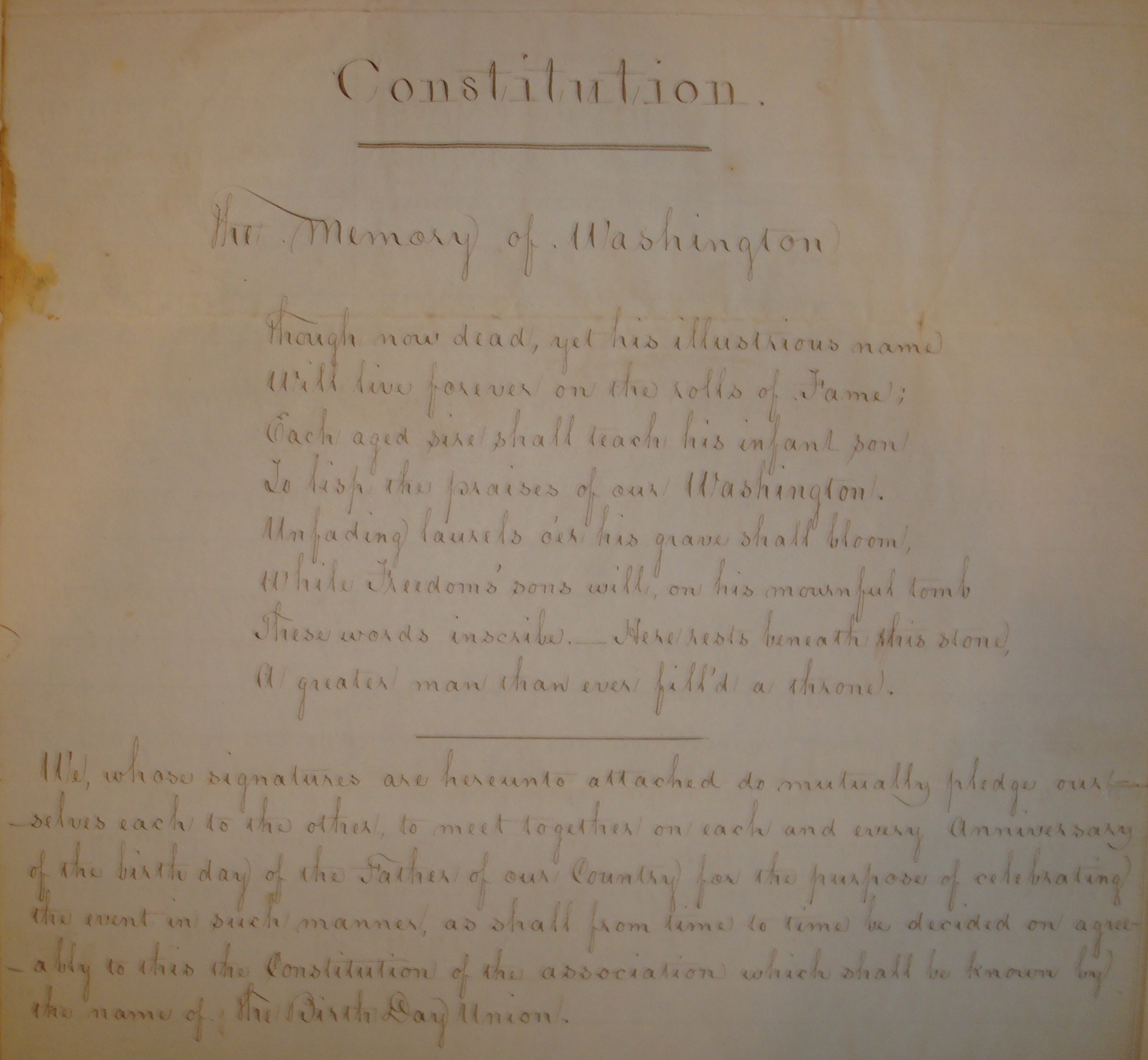The earliest beef steak dinners held at Shannon’s Corner were organized by The Birth Day Union, an association of thirteen men dedicated to the memory of George Washington. William Shannon, the original proprietor of the tavern, was a charter member of the association, which met annually on Washington’s Birthday.