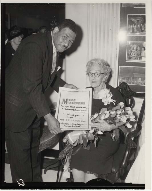 The Museum’s exhibition was dedicated to Equity’s Golden Anniversary and included a benefit performance commemorating Equity’s accomplishments. In the midst of the month of celebration, Equity took time to recognize the Museum’s Theater Curator, May Davenport Seymour, at a special exhibition preview arranged specifically for Equity members. Frederick O’Neal, Equity’s president-elect (the first African-American Equity president), presented Ms. Seymour with 50 roses and a scroll honoring her achievements as the founder of what was then called the Theater and Music Collection at the Museum. Ms. Seymour retired one month later after nearly 36 years spent establishing and curating the Museum’s collection.