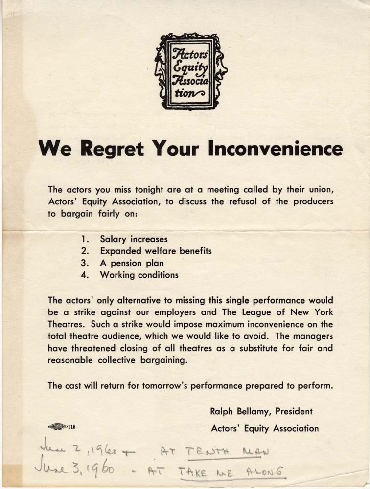 The celebratory approbations were well deserved considering that just three years prior the organization was in another round of heated negotiations with theater owners. One of the major issues on the table was the establishment of a a pension plan. On June 1, 1960, the performers in The Tenth Man exercised a one-night shut down as protest in accordance with Equity’s harassment policy. The next day, performers at 22 New York theatres showed up to work only to be informed that the show would not go on. The result was the largest work stoppage since 1919 in what theater producers dubbed a strike but Equity called a lockout. The Mayor’s office intervened with a plan to support pensions and the dispute was settled in less than two weeks at the expense of about one million dollars in ticket sales.