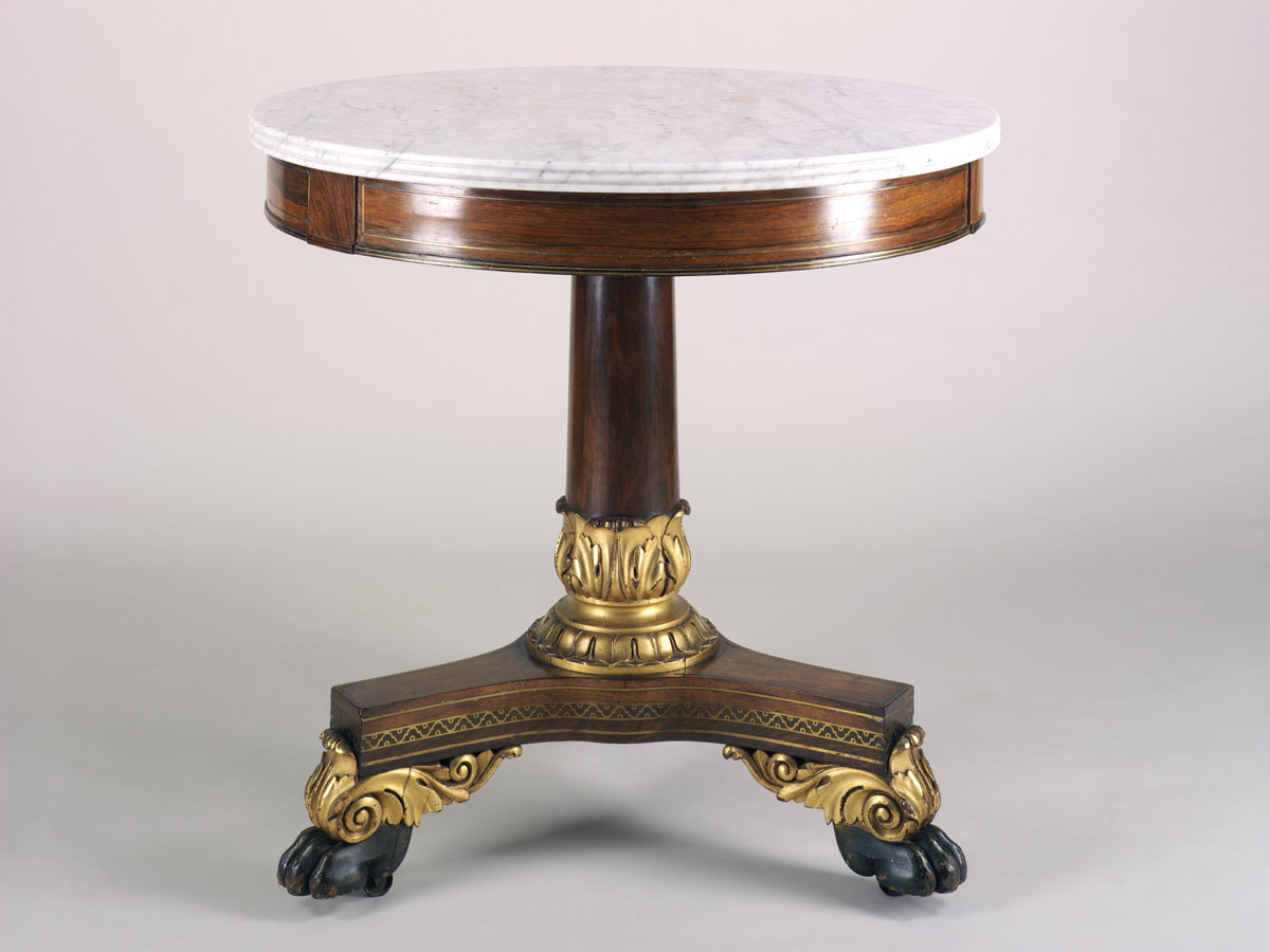 The center table represents the highest-quality New York City furniture from the Empire period (1810-1840). While simple in form, its circular table top on tripod pedestal makes use of fine cut-brass inlay, exquisite woodwork in the luxurious rosewood veneer over secondary woods–white pine and mahogany, painted scagiola, and freehand and stenciled gilded decoration. These features embody the best craftsmanship found in the city in the early nineteenth century, which was then an important center of cabinetmaking. The boldly-reeded central columns ebonized with gilded highlights, heavy acanthus-leaf band at the column base, and verd antique (a coating meant to imitate the look of patinated bronze) on the gilded pedestal and paw feet illustrate the classical vocabulary popular in the period. An examination of these details supports the attribution of this piece to the workshop of Duncan Phyfe (1770-1864). Phyfe was one of the preeminent cabinetmakers in New York City, alongside contemporaries such as Charles-Honoré Lannuier (1779-1819). Both cabinetmakers immigrated to New York City from Europe: Phyfe was born in Scotland and Lannuier in Chantilly, France, and both brought styles and training from Europe to New York City where they were adapted to the New York City market. The strongest evidence for the attribution to Phyfe is found in a center table documented in 1822 as made in the Phyfe shop now in the collection at Winterthur Museum (1957.944). The form of the Winterthur table, particularly the shape of the foot and its verd antique paw feet, are nearly identical to those on the MCNY center table. The painted tondo acts as a centerpiece to the table, and while rare, this device is found on contemporary center tables, such as one attributed to John Finlay of Baltimore in the collection of the Brooklyn Museum of Art (88.24).
