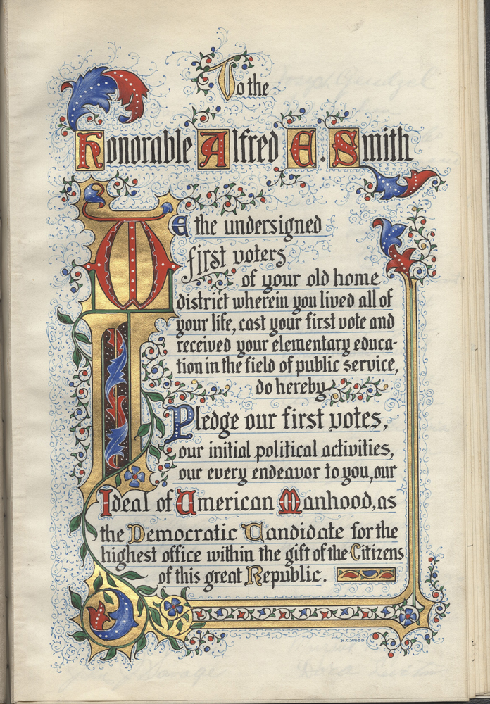 Front page of a book of signatures pledging support for Smith in the 1928 presidential election. 1928. Museum of the City of New York. 45.117.56