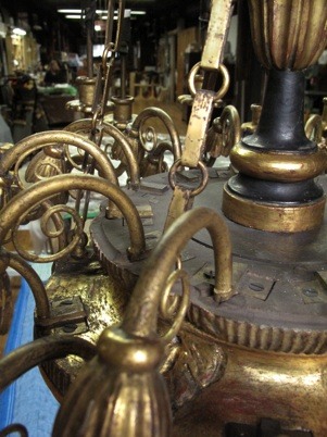 Image after cleaning showing techniques used on original surface: the brass chains, the central column which is water gilded on gesso, the arms of the chandelier which are oil gilded over metal, and the base or font which was burnished water gilded. Image courtesy Giovanni Bucchi.