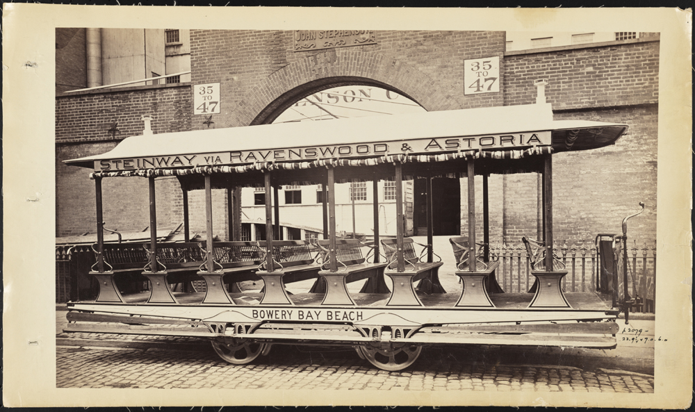 Photograph taken by Waller for the John Stephenson Company. Summer Cars [Bowery Bay Beach streetcar, Steinway via Ravenswood & Astoria.] ca. 1883. Museum of the City of New York. 44.295.133