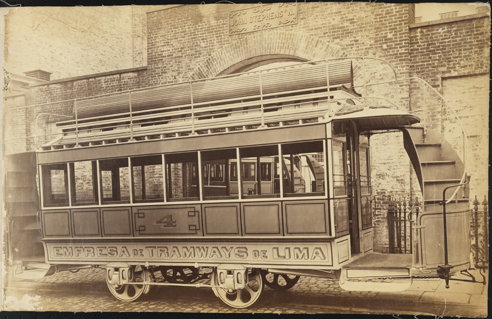 Photograph taken for the John Stephenson Company by unknown photographer. Double-decker Cars [Empresa de Tramways de Lima No. 4 streetcar with knifeboard seating on upper deck.] ca. 1875. Museum of the City of New York. 44.295.272