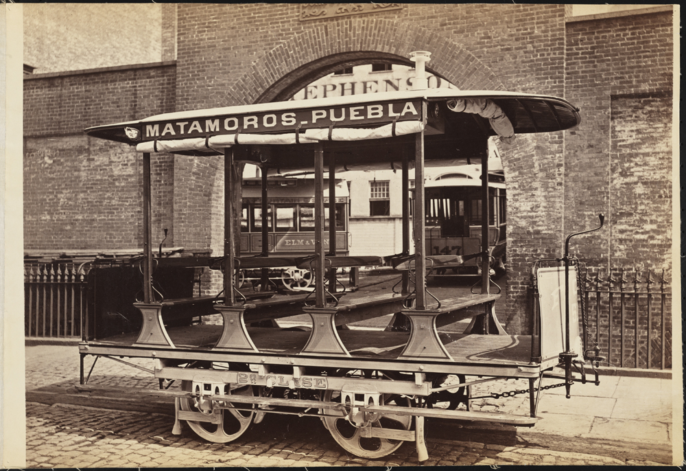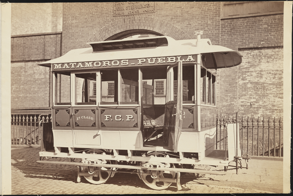 Photograph taken by Waller for the John Stephenson Company. Special Cars [Matamoros – Puebla streetcar for first-class passengers with side entrance.] ca. 1880. Museum of the City of New York. 44.295.300