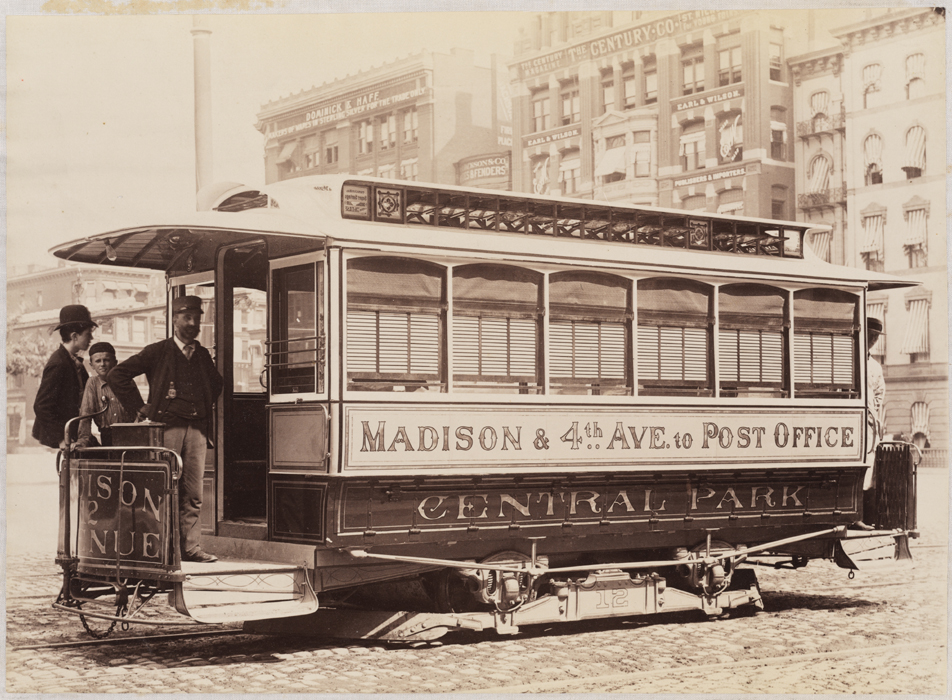 Photograph taken by the Pach Brothers for the John Stephenson Company. Electric Cars [Madison & 4th Avenue to Post Office, Central Park No. 12 streetcar with Thomson-Houston motor.] ca. 1890. Museum of the City of New York. 44.295.379