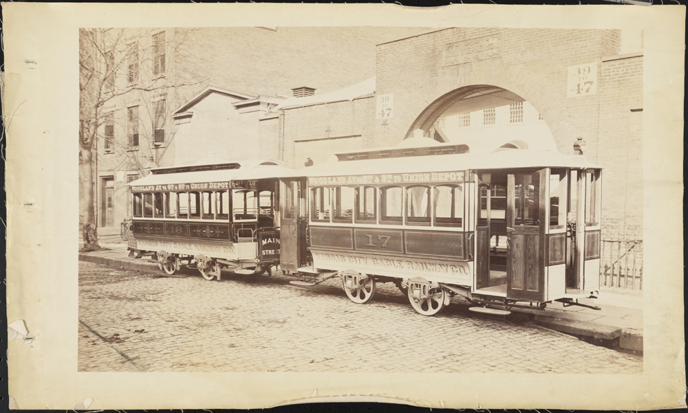 Photograph taken for the John Stephenson Company by unknown photographer. Cable Cars [Kansas City Railway Co. Nos. 18 and 17 streetcars, Woodland Avenue via 8th & 9th to Union Depot.] ca. 1885. Museum of the City of New York. 44.295.451