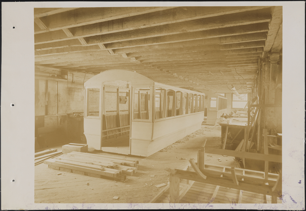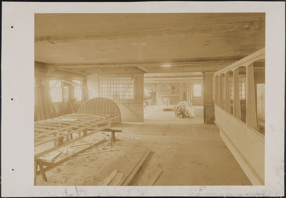 Photograph taken for the John Stephenson Company by unknown photographer. Factory [Interior of the John Stephenson Company factory at 47 East 27th Street, streetcar near completion.] ca. 1889. Museum of the City of New York. 44.295.481