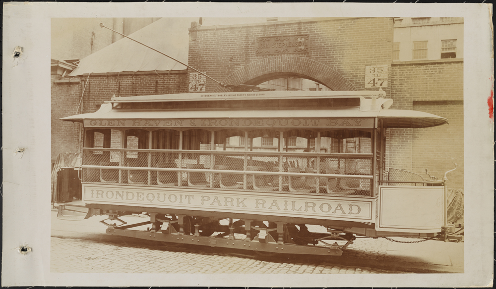 Photograph taken for the John Stephenson Company by unknown photographer. Aisle Cars [Irondequoit Park Railroad streetcar, Glen Haven & Irondequoit Bay.] 1893-1894. Museum of the City of New York. 44.295.94