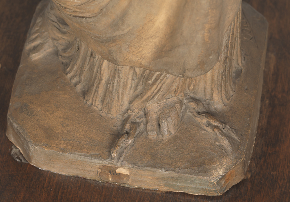The other sculpture, shown below, is made from terracotta, and perhaps holds some clues as to how the Museum became associated with the rumors concerning the Statue’s origins. The 19 3/8 inch maquette is estimated to have a date of ca. 1870. The terracotta sculpture was a gift of Estella Cameron Silo in memory of her husband, James Patrick Silo, in 1933, but again, the Museum does not have documentation regarding how Mr. Silo acquired the object.