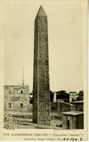 Cleopatra’s Needle is one of a pair of granite obelisks (the other today sits on the banks of the Thames in London) from the Temple of the Sun in Heliopolis (modern-day Cairo) built to commemorate the 40th year of the reign of Thothmes III (1476-1425 BCE). In 12 BCE, Roman Emperor Augustus moved the obelisks to Alexandria. Both obelisks were hence known as Cleopatra’s Needle, though seven years had passed since Cleopatra’s death.