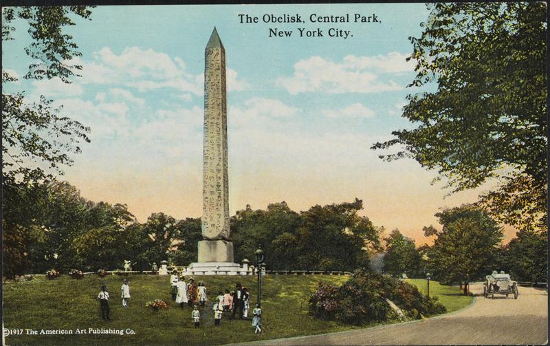 Cleopatra’s Needle in Central Park on a postcard published in 1917 by American Art Publishing Company, MCNY F2011.33.940.