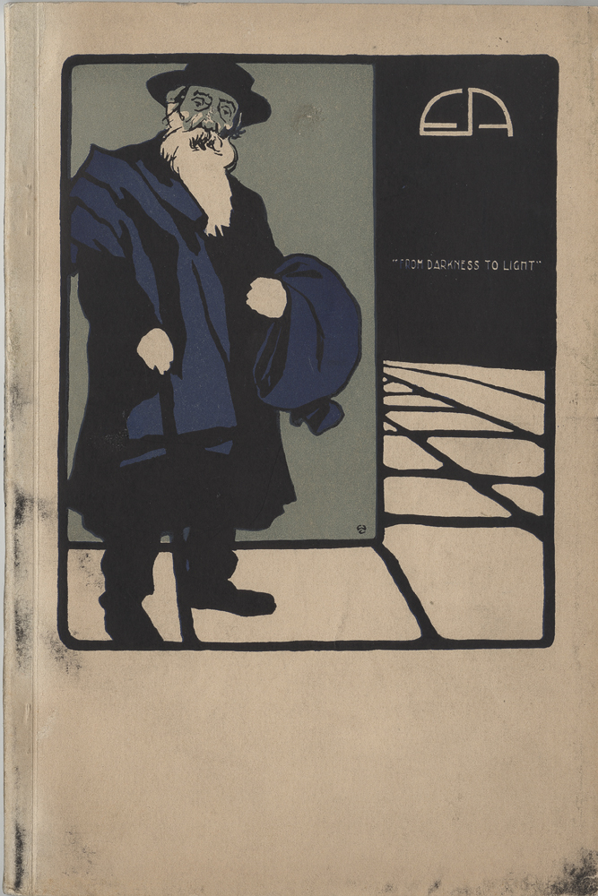 William Auerbach-Levy was born in 1889 in Brest-Litovsk, then part of the Russian Empire. He immigrated with his parents to the United States around 1894 and grew up on the Lower East Side. He began drawing at a young age and eventually became renowned for caricature. He executed serious illustrations with equal skill, however, as shown below on the cover of the 1916 annual report of the Educational Alliance.