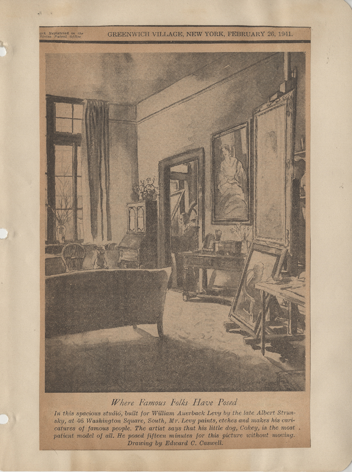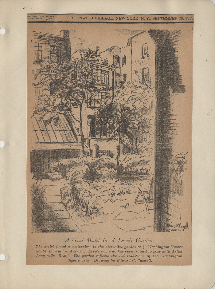 The artist Edward C. Caswell drew Auerbach-Levy’s studio and garden, and the drawings were printed in the Greenwich Village publication The Villager. Auerbach-Levy cut out the drawings from the newspaper and added them to his scrapbook.