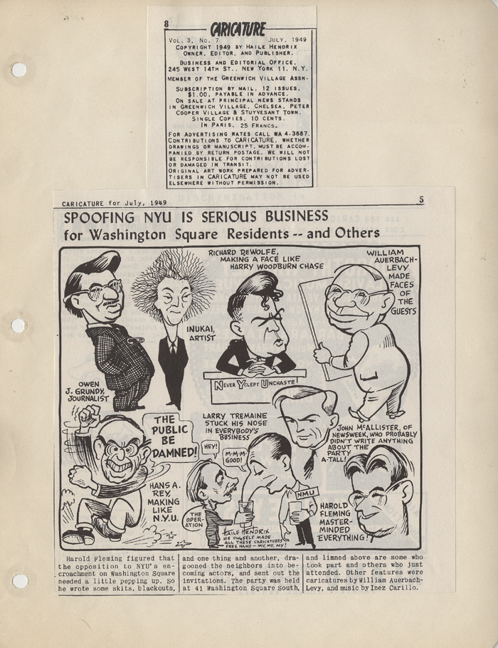 Not only did Auerbach-Levy document NYU’s expansion into Greenwich Village and the neighborhood’s attempts to stop it, he joined in the fight. As recounted in the June 16, 1949 issue of The Villager, “Skits Poke Fun At Tenants, Officials”: “Representatives of press and radio were honored guests Monday night, June 6, at a rollicking party in the studios of Beatrice Worthington and Ines Carillo, Washington Sq. S… The highlight of the evening was ‘a one shot, first and last showing’ of three skits entitled ‘The Follies of Washington Sq.'” The skits were written by Harold M. Fleming and produced by other soon-to-be-displaced tenants. Auerbach-Levy provided on-the-spot caricatures of people in the audience.