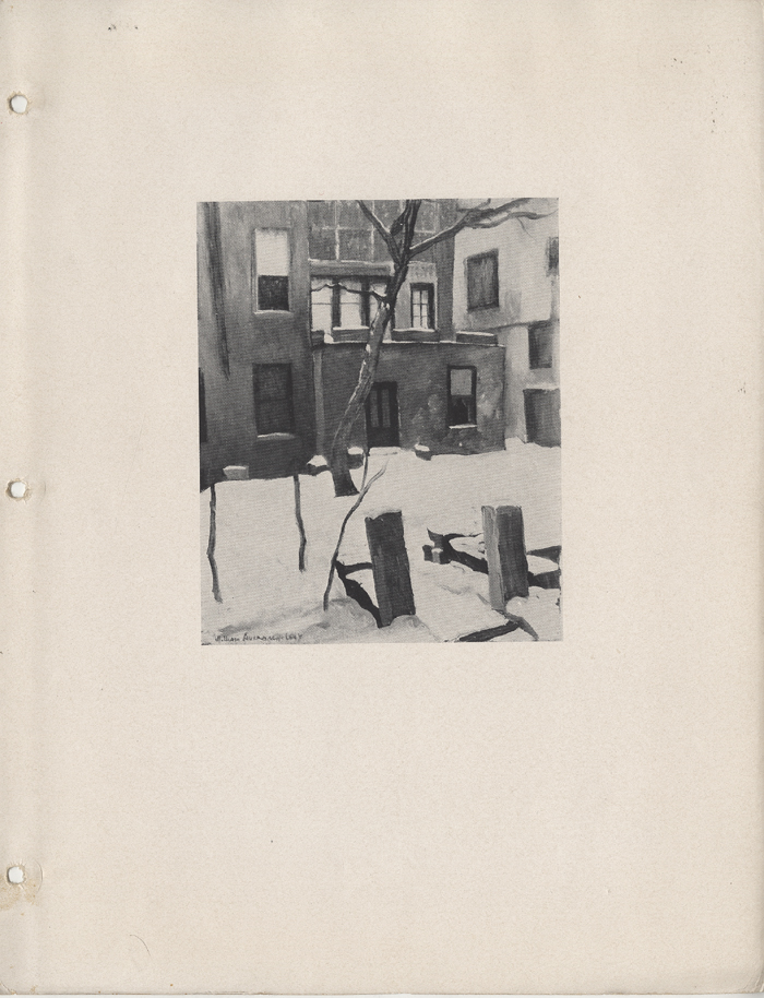 The second page of the scrapbook includes a reproduction of an oil painting produced around 1934 by Auerbach-Levy depicting his impression of Greenwich Village in winter.