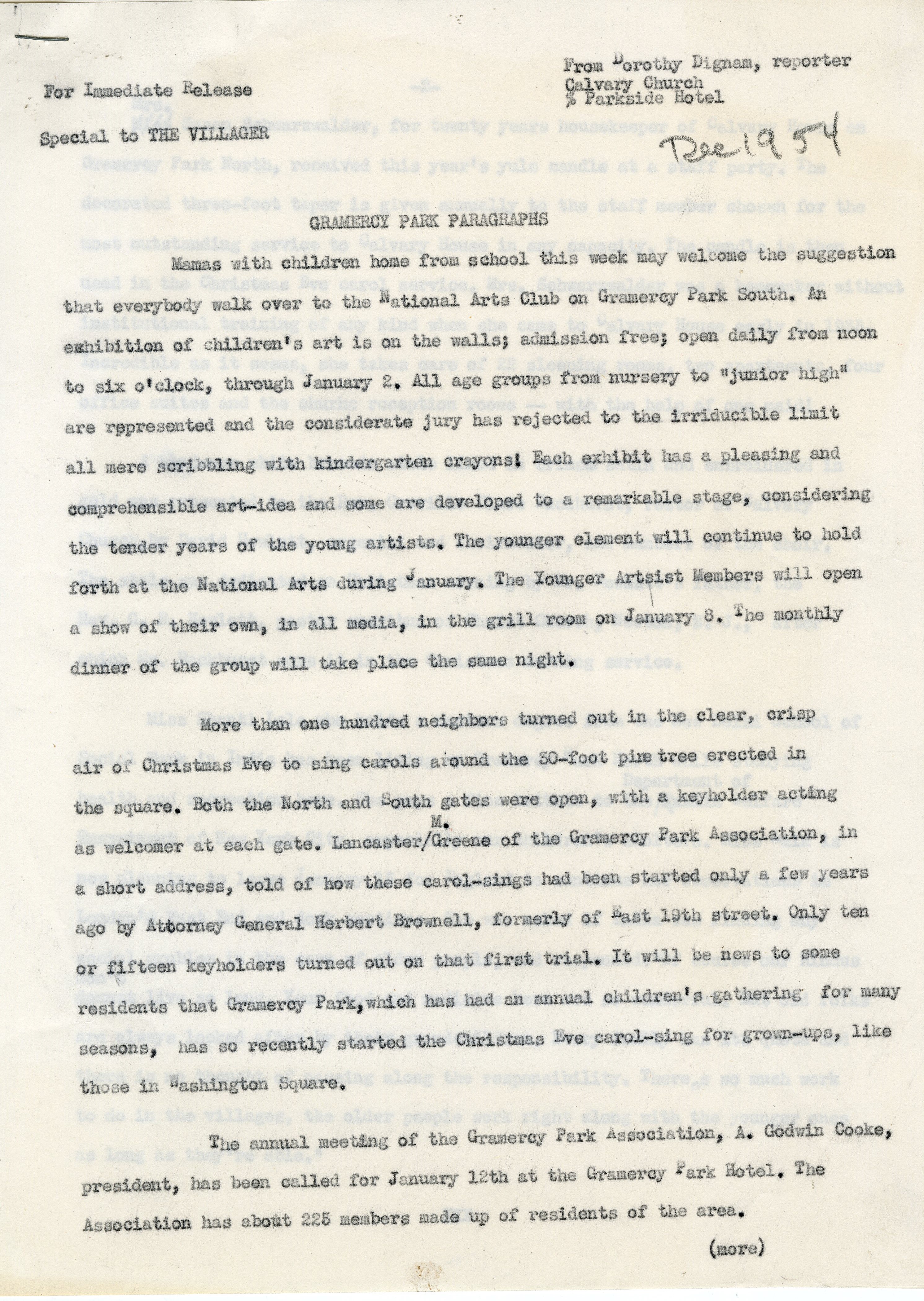 Gramercy Park Paragraphs, December 1954, in the Dorothy Dignam Collection on Gramercy Park. Museum of the City of New York. PRO2014.3, folder15.