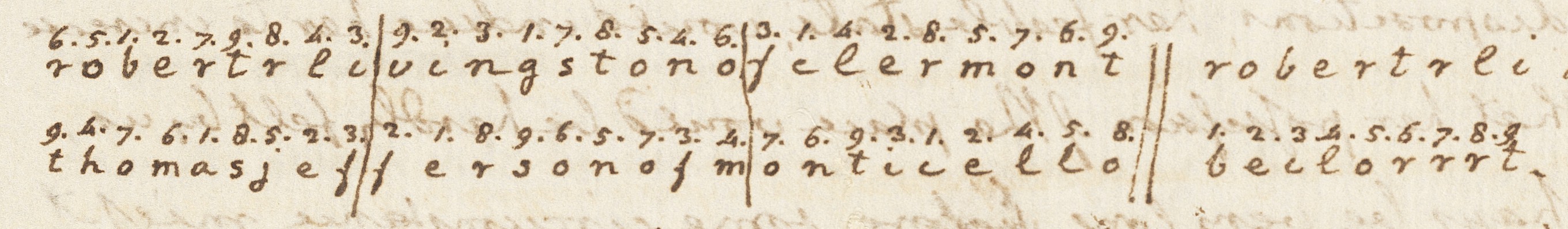 So Jefferson decided to devise a set of keys that was completely original and that either correspondent could recreate at any point he chose. He began by spelling out Livingston’s full name and the full name of Livingston’s home in upstate New York. Together, the whole thing happened to total exactly 27 letters: