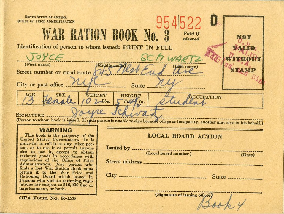 War Ration Book No. 3, Joyce Schwartz, 1943, in the Collection on World War I and World War II. 2003.18.1c.