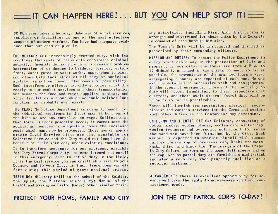 Along with the shortage of food during World War II, New York City was also experiencing a shortage of workers. Men were being sent overseas and New York was considered a prime target of attack, necessitating extra protection at home. In 1942 City Patrol Corps was founded as a reserves police force.This handout urges New York citizens to join the City Patrol Corps in manning the additional posts during wartime as well as protecting New York citizens from “additional menaces.”