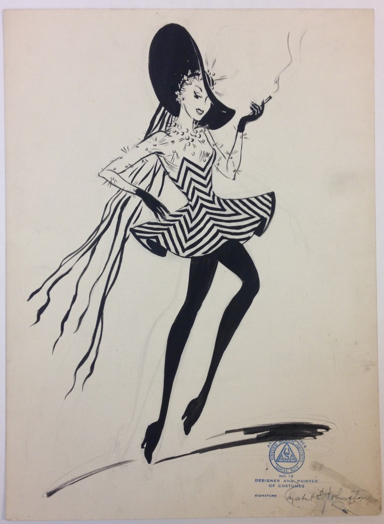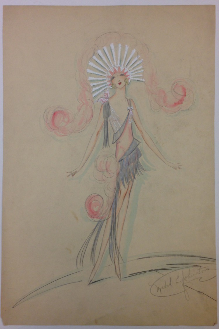 In 1978, the Museum received a collection of costume design renderings that featured the work of well-known theatrical designers such as Boris Aronson, Charles Le Maire, and Vincent Minelli.  Also included in the gift were over 150 renderings by the donor, a Miss Mabel E. Johnston. Johnston’s drawings  feature a wide range of designs, everything from the whimsical to the outrageous to the strangely elegant, but almost nothing is know about her. When was she born? How did she get started as a designer? And where did she find inspiration? In putting together this blog post, I’m not sure which was more difficult:  unearthing information on Johnston or having to choose only 12 drawings to showcase from her incredibly rich body of work.