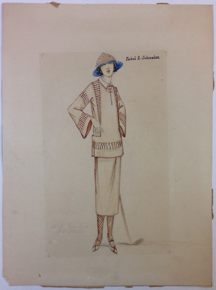 The first tidbit I found comes from the Forty-Sixth Annual Report of the Pennsylvania Museum and School of Industrial Art, noting that a Mabel Emma Johnston graduated with a diploma from the Department of Industrial Art in 1922. The report also reveals that earlier that year she was awarded two prizes for costume design in the competition “Good Taste in Dress for Young Girls.”  Below is one of her winning designs, a golfing outfit. As part of the prize, the costume design was built by Hattie Carnegie’s company and given to Johnston at the awards ceremony held at the Art Center, Inc. on East 56th Street.