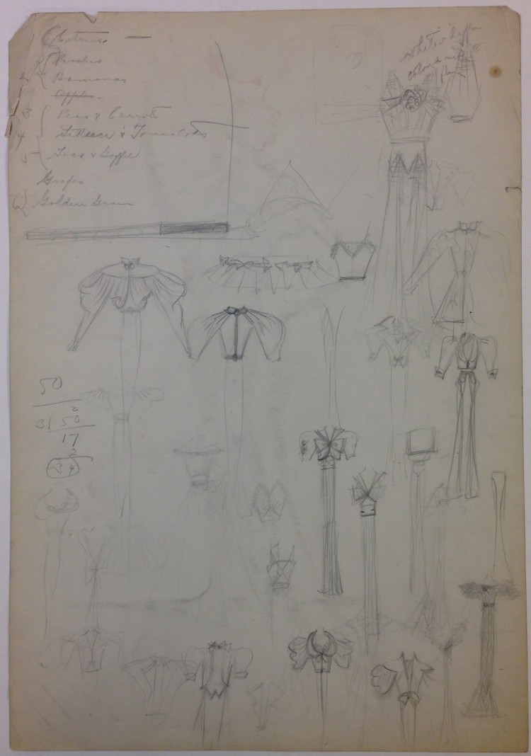 Occasionally the drawings include working sketches on the reverse. The dress below features a neckline that appears to include vegetables, but pencil sketches on the back seem to explore other options.