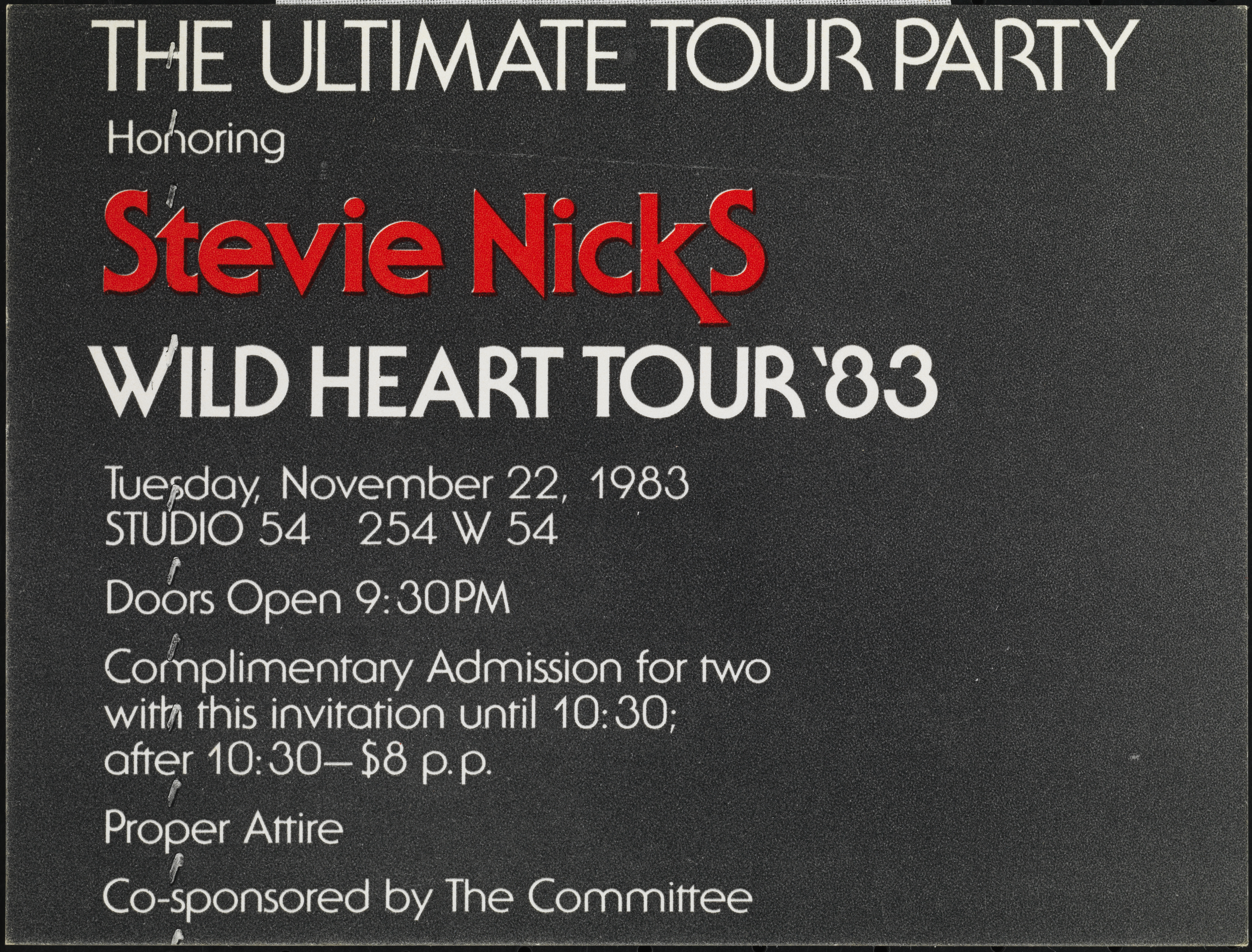 Studio 54 invitation to Stevie Nicks Wild at Heart Tour, 1983, in the Collection on Culture and Nightlife. Museum of the City of New York. 2013.8.7.