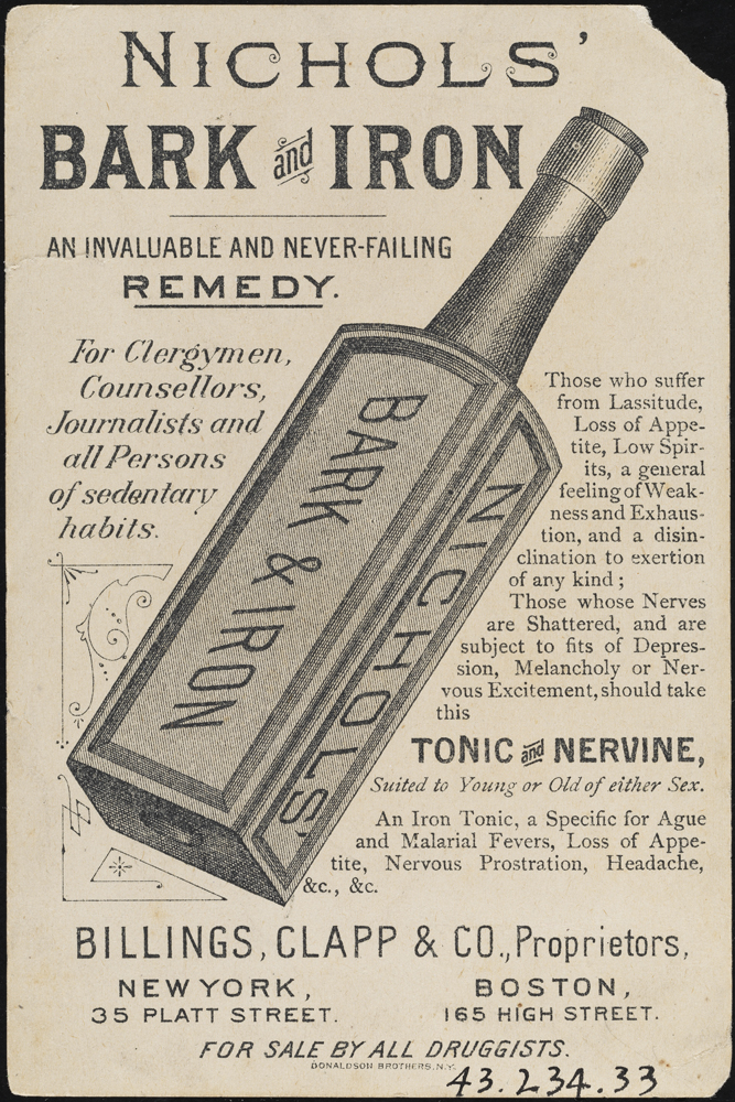 Printed by Donaldson Brothers (Firm). Nichols’ Bark & Iron. ca. 1880. Museum of the City of New York. 43.234.33 (verso)