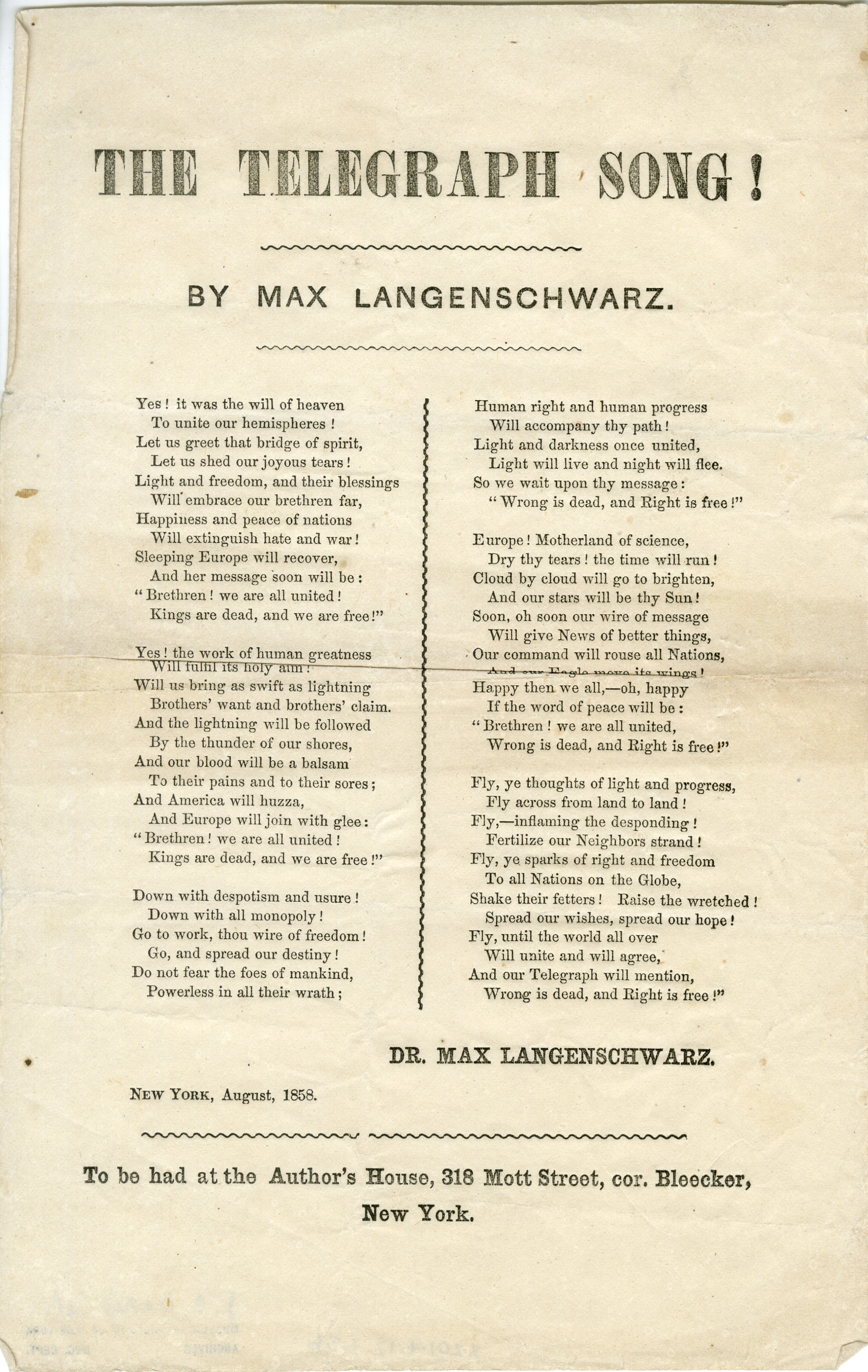 The Telegraph Song, by Max Langenschwarz, 1858, in the Collection on Civic Events. Museum of the City of New York, X2014.12.356.