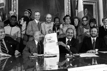 NYC Mayor Abe Beame, Manhattan Boro President Percy Sutton and NYRR President Fred Lebow with NYC Proclamation for the inaugural 5 Boro NewYork City Marathon in October 1976. Photograph by Paul J. Sutton. (Duomo/PCN Photography)