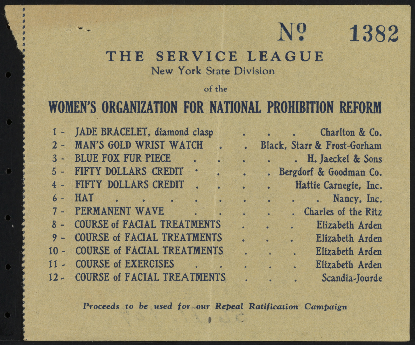 Ticket Stub, The Service League, New York State Division of the Women’s Organization for National Prohibition Reform, ca. 1929-1933. Museum of the City of New York. 56.71.109.