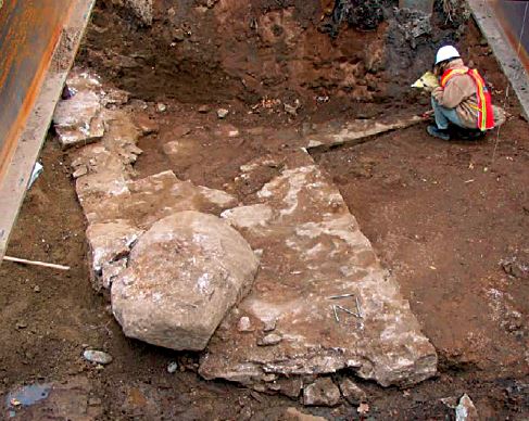 A segment of the Battery Wall exposed beneath modern utility lines during the South Ferry Terminal Project in 2005. This segment was nearly 40 feet long. Image from South Ferry Terminal Project Report 2012.