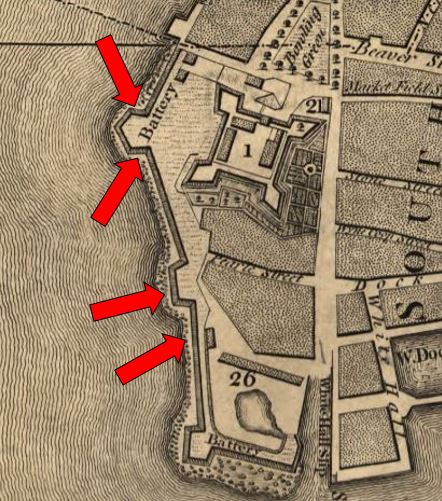 Detail of the “Plan of the City of New York” by Bernard Ratzer depicting the Battery Wall in 1766-1767. The approximate locations of the four wall segments excavated in 2005 are indicated with red arrows. Map image from the U.S. Library of Congress (accessed December 19, 2015).